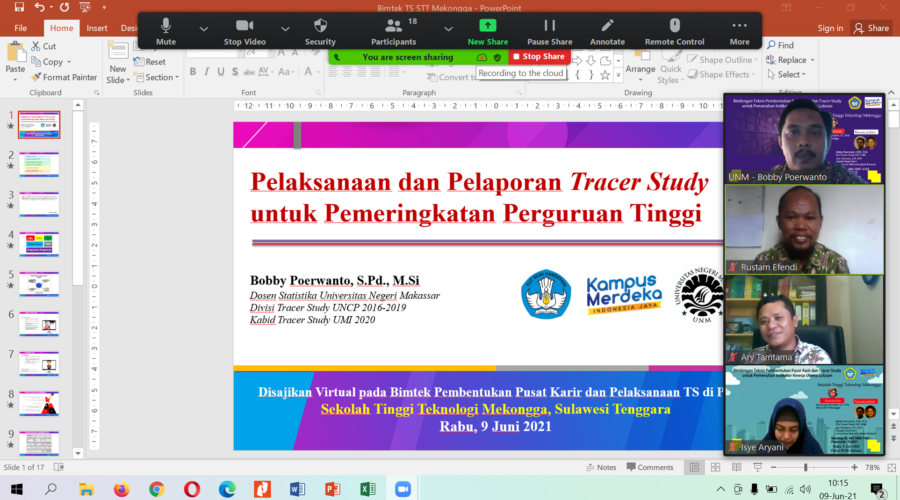 Dosen Statistika FMIPA UNM, Bapak Bobby Poerwanto, S.Pd., M.Si kembali diberikan kesempatan untuk menyampaikan materi mengenai pelaksanaan tracer study sesuai standar Kemdikbudristek. Kegiatan ini dilaksanakan secara virtual dengan peserta dari Sekolah Tinggi Teknologi Mekongga, Kolaka Sulawesi Tenggara pada hari Rabu, 9 Juni 2021. Selain memaparkan mengenai pelaporan tracer study, pada kesempatan itu juga dijelaskan mengenai metode analisis data yang tepat digunakan untuk menginterpretasikan hasil tracer study sehingga dapat menggambarkan keadaan...Read More