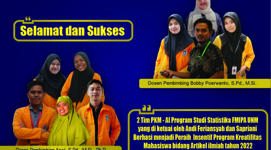 Program Studi Statistika FMIPA UNM mengukir prestasi di kancah Nasional. Dari 4 tim Program Kreativitas Mahasiswa Bidang Artikel Ilmiah (PKM-AI) UNM yang berhasil menjadi peraih insentif PKM-AI, 2 tim diantaranya berasal dari Program Studi Statistika FMIPA UNM. Berikut Judul dan Nama tim yang lolos : 1. Dosen Pembimbing: Aswi, S.Pd., M.Si., Ph.D. Ketua: Andi Feriansyah – Statistika 2019 Anggota: Idul Fitri Abdullah – Statistika 2019 Siti Choirotun Aisyah...Read More